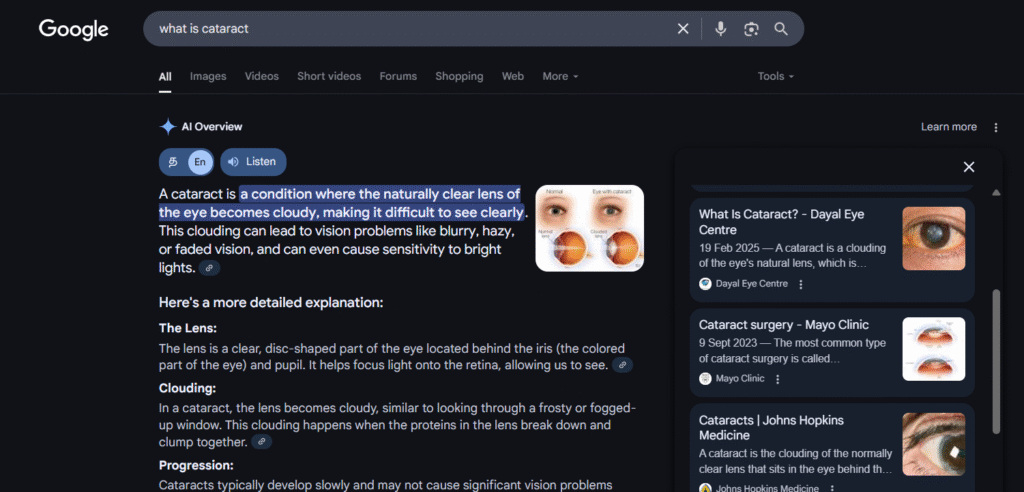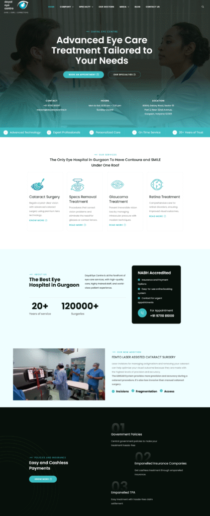 Content Strategy: Created service-specific landing pages (e.g., Cataract Surgery, LASIK, Retina Care) with keyword-rich, patient-friendly content.