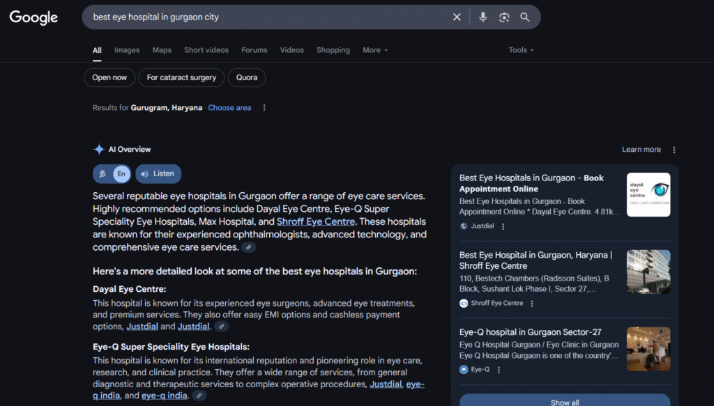 - Top 3 Rankings Achieved for high-intent keywords like “Cataract Surgery in Gurgaon” and “Best Eye Hospital in Gurgaon”